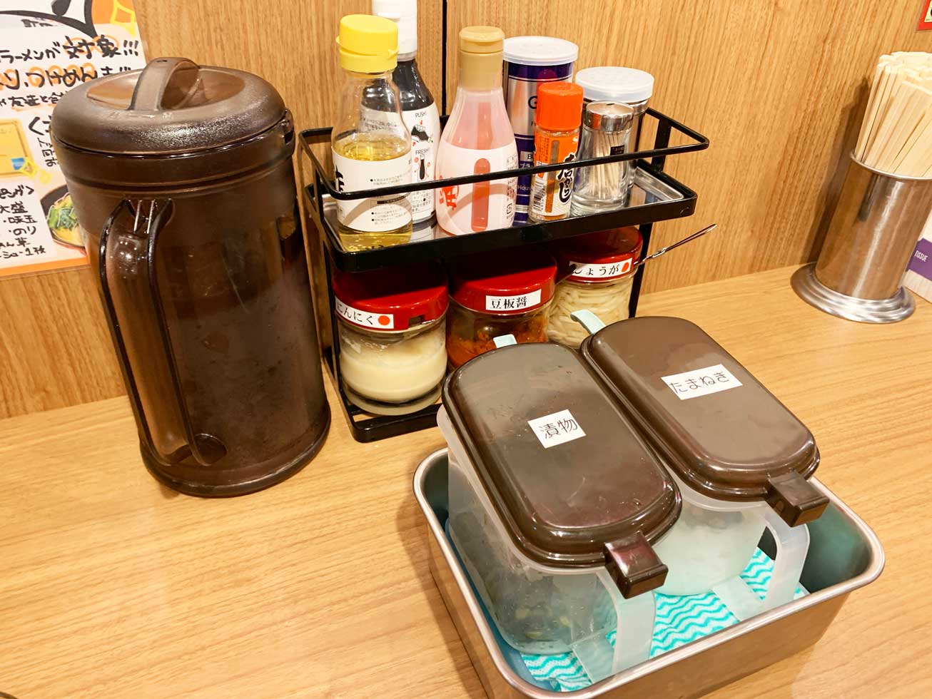 などが無料トッピングとして利用可能となっていました。お水はピッチャーが置かれているので、セルフで入れる感じです。