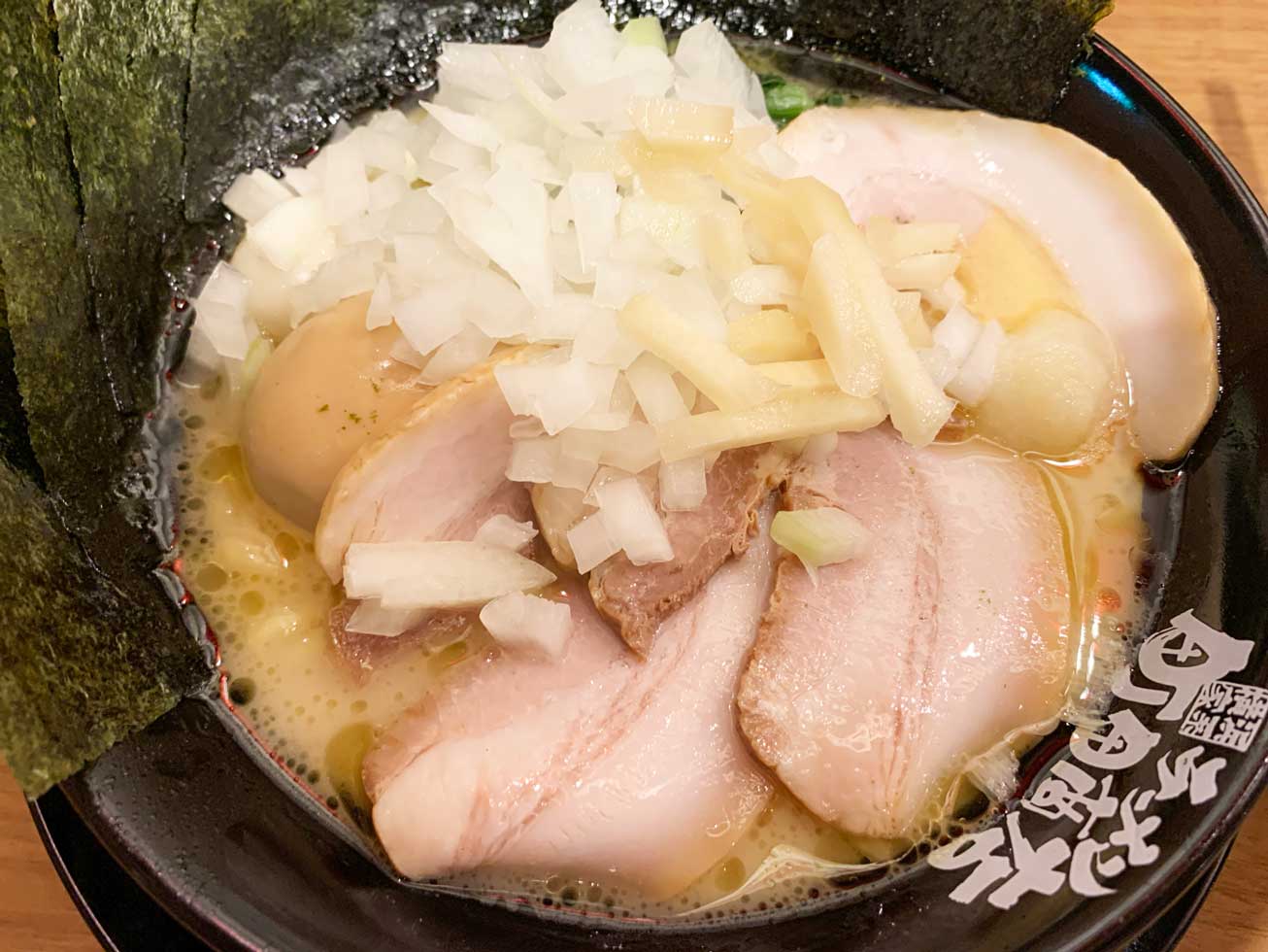 ラーメンは刻み玉ねぎとライスがとても合います。ニンニクとしょうがも入れて、クリーミー&濃厚なスープと共に頂きます。